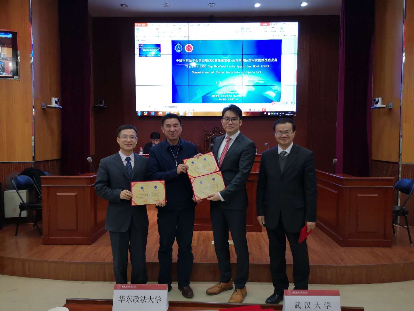 2018年12月22日至23日,中国空间法学会第15届CASC杯曼弗雷德·拉克斯国际空间法模拟法庭竞赛在北京理工大学隆重举行,本次竞赛共有来自完美电竞官网、中国政法大学、中南财经政法大学、华东政法大学、北京理工大学等全国8所高校的12支代表队(含职工队)参加了本届竞赛。公司代表队由西安交通大学苏金远教授担任远程教练,2016级研究生应瑶慧担任助理教练与领队。完美电竞2017级研究生陈江南、吕小容,2018级研究生刘佳宸、黄文青和边海院2017级研究生黄俊参加了本次比赛。经过两天的激烈角逐,武大代表队在本次模拟法庭竞赛中表现出彩,继去年首次参与该赛事后再次获得亚军、一等奖。同时,武大代表队所提交的书状以综合成绩第一名荣获“最佳书状奖”,陈江南同学荣获“优秀辩手奖”。此外,赛队指导教练也获得了“优秀领队奖”及“最佳书状指导奖”的荣誉。